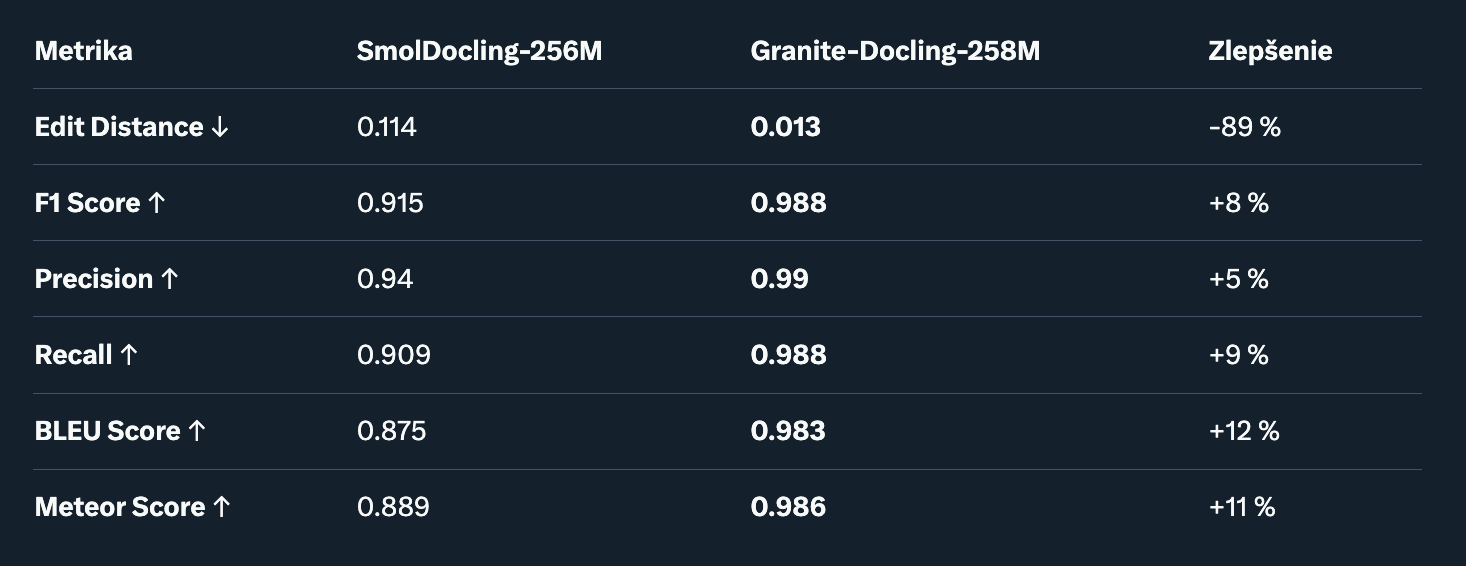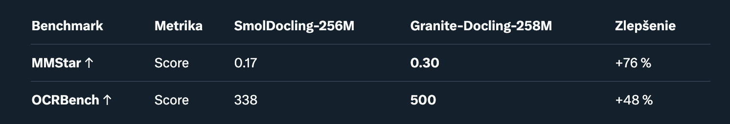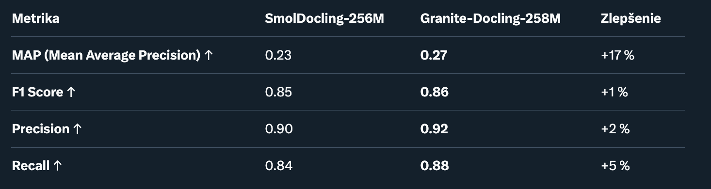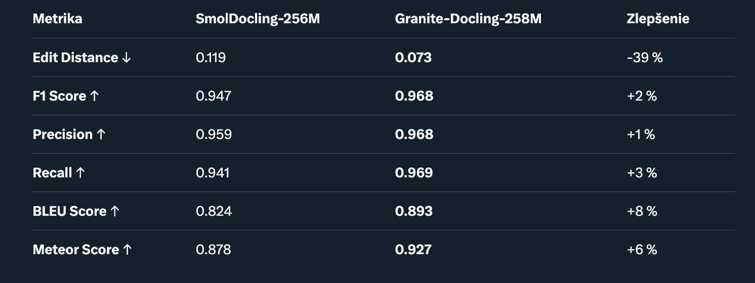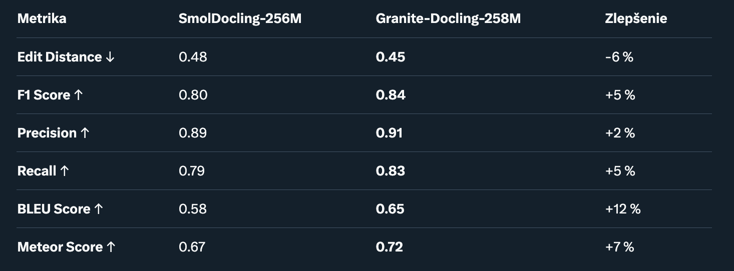- Celkové zlepšenie: Priemerné +20-30 % oproti SmolDocling, s 10x menšou veľkosťou oproti veľkým modelom ako Llama-Vision.