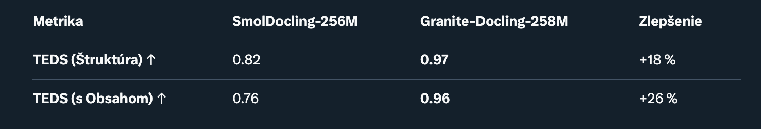 Poznámka: TEDS (Table Extraction and Detection Score) meria štruktúru a obsah – Granite-Docling exceluje v exporte do HTML/JSON bez strát.